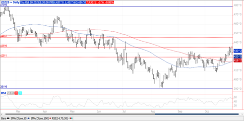 Prices were $.02-$.04 lower in choppy 2 sided traded.  Early strength in spreads couldn’t hold, easing into the close.  Dec/Mch traded up to a fresh 6 month high at $.11 ½ before fading.  Dec-25 rejected trade into a fresh 4 month high.  Moving Ave. support below the market comes in at $4.20.  No mention of China interest in US corn helped fuel today’s bearish sentiment.  The European Commission kept their EU production forecast unchanged at 56.8 mmt, vs., the USDA forecast of 55.3 mmt.  With the partial Fed. Govt shutdown now in its 5th week, no export sales today however analysts expect sales last week to have ranged from 45-85 mil. bu.  It’s estimated speculative traders bought nearly 3k contracts of corn yesterday cutting their net short position to around 70k contracts.  Despite US exports and corn usage for ethanol holding up well, feed usage is likely being overestimated by the USDA.  Unless US yields fall to 180 bpa, from the current record of 186.7, it’s difficult to envision a scenario for US 25/26 stocks falling below 2.0 bil. bu.  US corn acres in drought fell 2% in the past week to 30%.