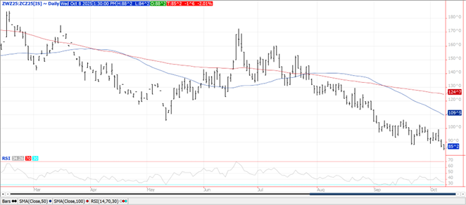 Prices recovered late to scratch out a slightly higher close. None of the 3 classes established new contracts lows for their spot Dec-25 contracts. Dec-25 CGO premium to Dec-25 corn however fell to a new low at $.85 bu. After a slow start Russian exports in Oct-25 are expected to increase to 5.1 mmt, up from 4.6 mmt in Sept. Despite the increase they are still expected to come up shy of the 6.1 mmt shipped in Oct-24. Ukraine’s exports in the July thru Sept period at 4.7 mmt are also down 23% YOY. The slow sales from the Black Sea region have benefited demand for US wheat with YTD commitments (last available data before Fed. Shutdown) up 24% vs. YA vs. USDA forecast of up 5%. Expectations for Black Sea shipments to improved can’t be viewed as bullish for global prices just ahead of S. Hemisphere harvest.