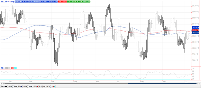 Prices were higher across the complex with beans up $.04-$.07 ½ extending session highs near the close, meal was $1-$2 higher while oil was up 45-50 points. Bean and meal spreads firmed while oil spreads were weaker. dm Nov-25 beans closed into new highs for the month while also above its 100 day MA. Dec-25 oil also jumped to a 3 week high closing in on MA resistance just above $.52 lb. Spot board crush margins were little changed at $1.48 ½ bu. however bean oil PV improved to a 2 month high at 48.1%. Argentina’s Labor Ministry ordered the Oilseed Workers Union to suspend plans for a strike over wages and benefits, effectively putting a 15 day pause allowing for negotiations to continue. Union workers had called for a strike starting today. This potential work stoppage may have also contributed to the bull spreading. Malaysia’s Palm Oil Board is set to release its September data this Friday. Analysts expect production to have slipped 3.3% to 1.79 mmt. Exports are expected to have risen 7.7% to 1.43 mmt, resulting in stocks falling to 2.15 mmt, down 2.5% from the end of August. Despite no soybean sales on the books to China, sales to all other countries at only 404 mil. bu. (last available data) is also historically low, however still up 4% from YA and 9.5% above 2019/20, the last trade war with China.