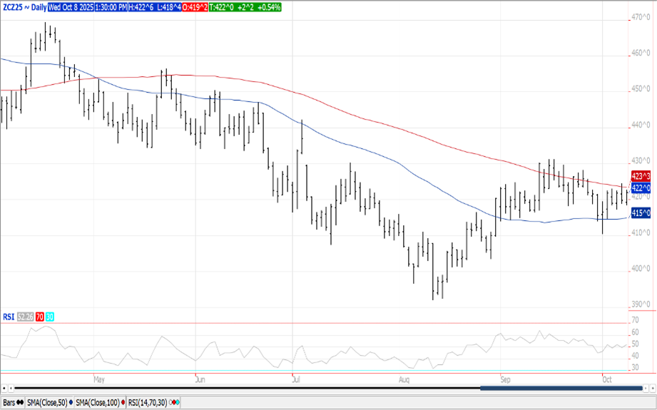 Prices were $.01-$.02 higher closing near session highs. For now Dec-25 remains stuck between its 50 day MA support at $4.15 and its 100 MA resistance at $4.23 ¼. Tomorrow’s USDA production and WASDE reports have been postponed or cancelled pending Fed. Govt. reopening. Ethanol production snapped back to 1,071 tbd, or 315 mil. gallons in the week ended Fri. Oct. 3rd, up from 293 mil. the previous week and up 3.2% from YA. Production was above expectations. There was 106.7 mil. bu. of corn used in the production process, or 15.25 mil. bu. per day, still below the 15.4 mbd needed to reach the USDA corn usage estimate of 5.60 bil. bu. In the MY to date there has been 492 mil. bu. used, or 14.9 mbd, an annualized pace of 5.439 bil. Ethanol stocks slipped to 22.7 mil. barrels, in line with expectations and above YA at 22.15 mb. Although implied gasoline demand rose 4.7% last week to 8.919 mbd, it was still off 7.6% from same week YA. Although export sales will not be released tomorrow due to Fed. Govt. shutdown, analyst estimates of sales last week range from 48–78 mil. bu.