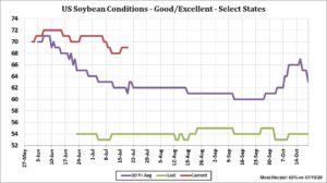 Soybean futures traded lower on improved US Midwest weather outlook. Managed funds liquidated net long positions in soybeans and increased net shorts in soymeal. USDA announced new US new crop soybean sales to China and unknown. Concern is that USDA old crop soybean export goal may be too high. This could add to US 2019/20 carryout. Rains are moving through C IL today. Rains will increase today in IA and IL. 7 day US Midwest weather forecast calls for normal temps and normal rains over most of the Midwest. 2 week forecast calls for mostly normal to above temps and normal rains. USDA estimated US soybean crop 69 pct good/ex versus 68 last week. Crops improved in AR, IL and MO. Crop ratings dropped in IA, MN, NE and OH. Best crop remain in the west. Ratings help support USDA soybean yield of 49.8. Some feel final yield could go higher. There continue to be concern about US 2020/21 demand. USDA estimates US 20/21 soybean demand to increase 500 mil bu. Some feel the demand may not increase. This could increase carryout to near 600 mil bu and push prices lower.