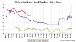 Corn futures traded lower. Managed funds increase their net short position on improved US 2 week weather outlook. Rains are moving through C IL today. Rains will increase today in IA and IL. 7 day US Midwest weather forecast calls for normal temps and normal rains over most of the Midwest. 2 week forecast calls for mostly normal to above temps and normal rains. US corn crop is running out of time to get hurt by dryness and heat. USDA estimated US corn crop 69 pct good/ex versus 69 last week. Crops improved in IL, MI, MO and SD. Crop ratings dropped in IA, NE and OH. Best crop remain in the west. Ratings help support USDA corn yield of 178.5. Some feel final yield could go higher. There continue to be concern about US 2020/21 demand. USDA estimates US 20/21 corn demand to increase 1.0 bil bu. Some feel the demand may not increase. This could increase carryout to near 3,600 mil bu and push prices lower. Interesting to note that China announced today that they are going to sell rice and rapeseed from their reserves to help supply corn feeding. Some wonder if record floods is reducing their corn crop and could increase their corn import demand. Weekly US ethanol productions should increase from last week. Stocks could also increase. Margins have dropped.