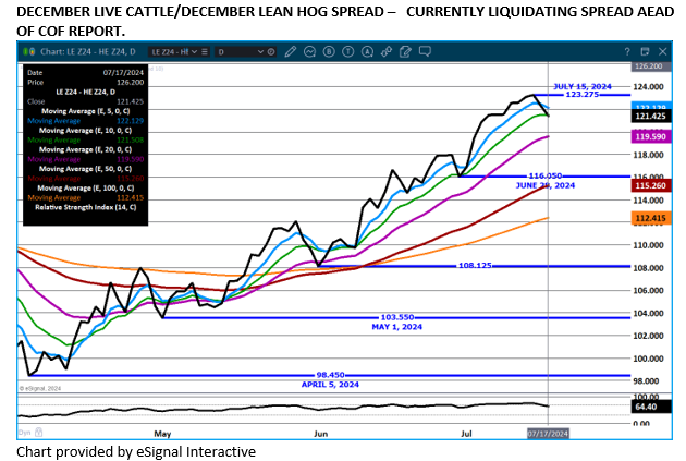 Lately, there has been a slight increase in slaughter and weights remain close to 30 pounds over a year ago. Beef imports are huge. The question is, are packers and beef wholesalers storing loins and rib primals for Labor Day or are they will the allow prices to further deteriorate? It’s about time for Live Cattle to start closing the cash and futures spread. With the wide difference, although there is still plenty of time until first notice day for august live cattle, the difference indicates cash prices are likely ahead for a steep drop between now and first notice day.