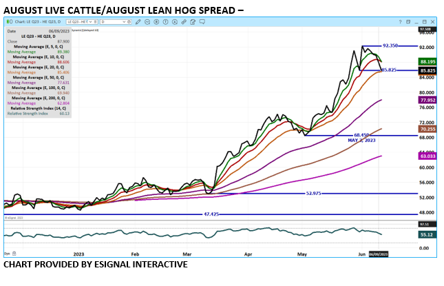 June Lean Hogs were lower as futures begin to drift to the CME Lean Hog Index that goes off the board this week. The difference between June and the Hog Index is $2.89 with futures over the Index. August and October were the strongest months as traders were buying hogs and selling cattle. Traders are anticipating more cattle and feel pork during the summer will compete with beef.