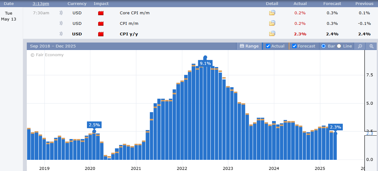 Consumer Price Index reported a drop in consumer inflation this morning. The market was expecting a 2.4% increase year-over-year and we reported a 2.3% increase. Inflation is still here, but has cooled off from the post-COVID highs.