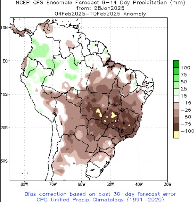 The 7-Day Precipitation Forecast Anomaly Map has almost all of South America’s growing regions receiving less than normal rainfall voer the next 7 days.