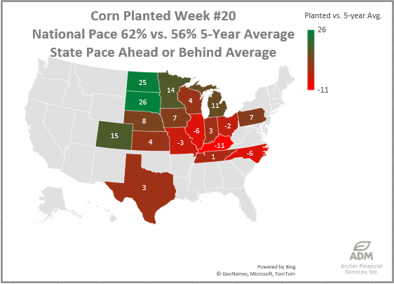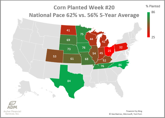 Corn Planting is ahead of the 5-year national pace by 6%. There are some pockets of concerns in southern Illinois, Missouri, Kentucky, and Ohio but overall corn planting is going very well here in the US.