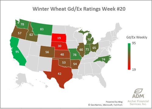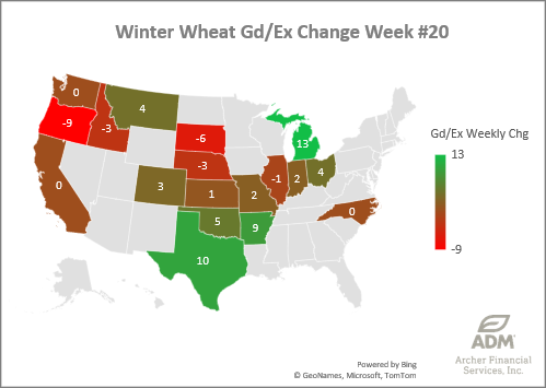 Winter Wheat Conditions increased week-over-week from 51% to 54% good/excellent. South Dakota and Nebraska are the two states presenting the most concern for quality. Texas had a 10% improvement from last week’s ratings.