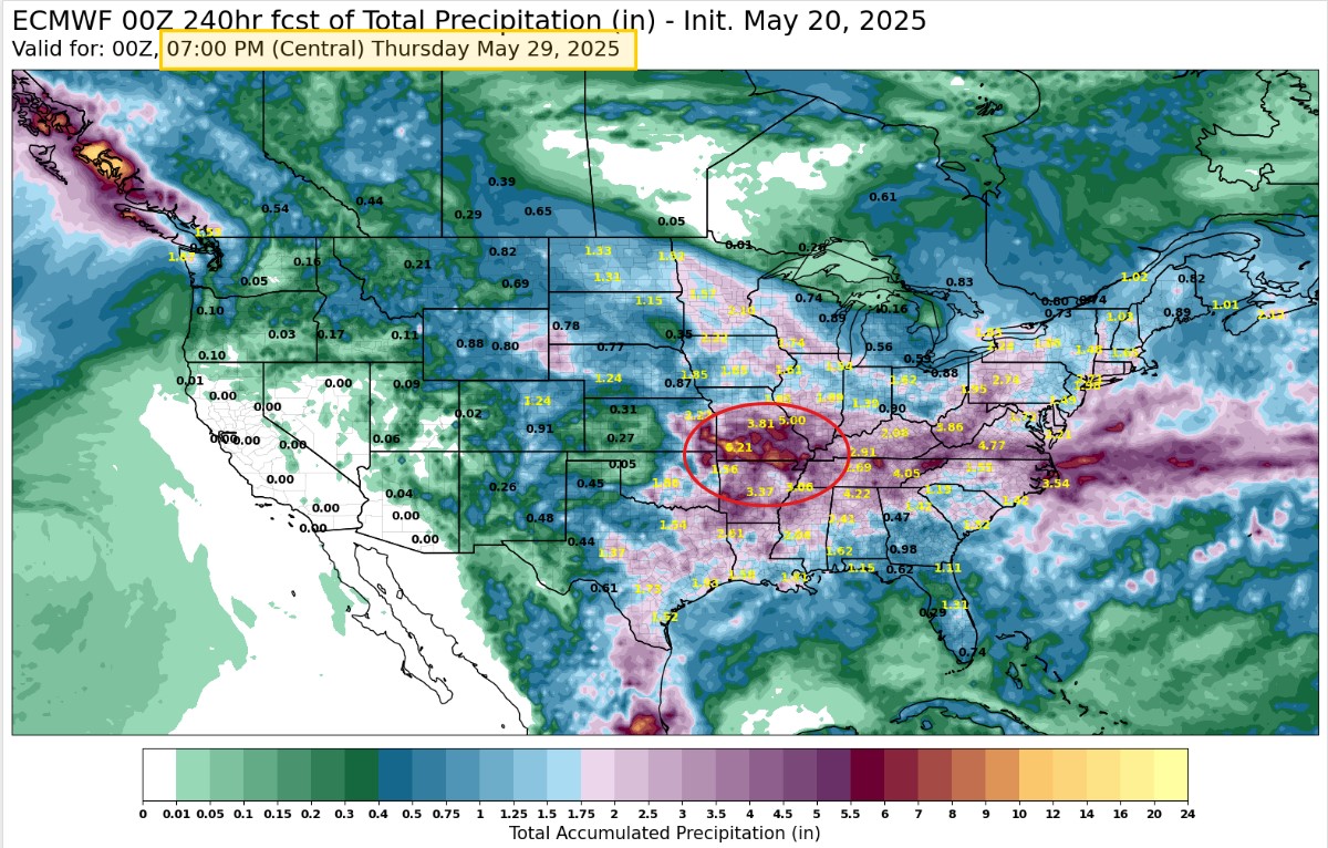 Central US Rain is expected to record over 6 inches in some areas of southern Missouri and northern Arkansas The totals below are for now through Thursday next week.