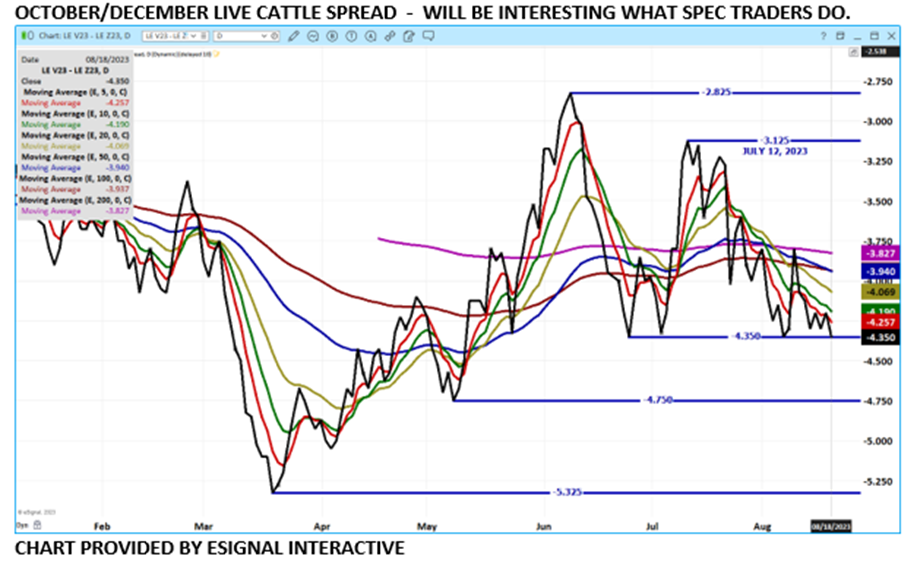 The increasing slaughter pretty much tells why hog prices are down. Slaughter as of August 19th is 1,000,000 more hogs year to date. Friday’s pork sales were large and it appears that packers are dumping pork. Compared to a week ago, the 5 day pork carcass average is down $4.02. Loins, Hams, Ribs and Belles lower and butts and picnics up, the cuts likely supported for Labor Day.