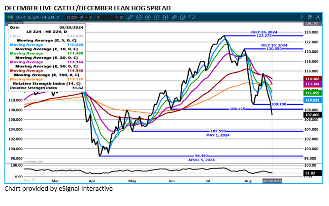 Friday’s Cattle on Feed report likely will show a few more cattle on feed. This year with increasing beef imports, increasing cattle imported for slaughter and more imported feeder cattle, the drop in Live Cattle futures Tuesday for October 2024 into 2025 was justified. As of morning sales on Tuesday choice boxed beef was down $3.79 from Friday. Unless retailers are going to increase buying the remainder of this week and early next week for Labor Day, it appears the need to buy beef for the holiday is probably over. After Labor Day, the need for beef begins to taper off.