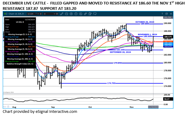 Live Cattle trade volume was moderate Tuesday as futures turned higher.  A gap was finally filled at $185.27  on the December live cattle contract that was left from the low on November 7th and traders were able to move the trade up to the November 1st high and resistance at $186.60.