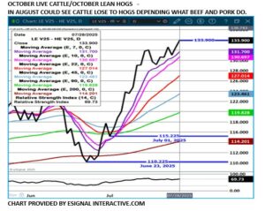 August live cattle gapped higher on the open reacting to the bullish COF and biannual inventory report. The high Monday on August live cattle came within .27 cents of the high made on June 2025 live cattle on June 12, 2025 at $229.12.
