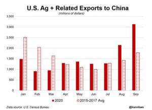 China’s strong return to the U.S. soybean market in recent months has single-handedly lifted U.S. farm exports to the Asian country to new records, and the heavy forward shipping schedule bodes well for the promises outlined in the Phase 1 trade agreement between the two countries; that agreement suggests China in 2020 will buy and import at least $36.5 billion worth of American agricultural products, an all-time high; progress was relatively dismal through mid-year, but the narrative has since changed.