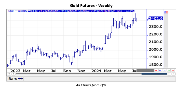 August gold futures advanced to record highs on July 17 in light of increasing prospects of a more accommodative Federal Reserve this year. Although there is a 95% probability that the Federal Open Market Committee will keep its fed funds rate unchanged at 5.25% to 5.50% at its July 31 policy meeting, financial futures markets are now pricing in three 25 basis point cuts in the fed funds rate this year.