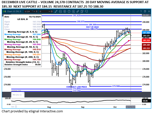 Trade volume was moderate Tuesday as Live Cattle futures turned lower. December Live Cattle dropped to the 20 day moving average and moved off the low settling below the 10 day average the first time since September 10th. October Live Cattle were lower as traders used the larger packer buy of last week as bearish for cash prices this coming week.