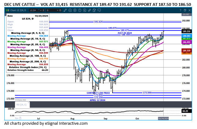 Packers opened up bids Thursday at $190.00 with a few as high as $192.00, $2.00 higher than a week ago. Dressed cattle were 298.00 up $2.00. Prices are the same in the Midwest and southwest. Live Cattle futures took the positive news and closed higher with December Live Cattle finally closing above $188.30 at $189.25. December opened on the 5 day moving average, dropped to the 10 day and reversed to close the highest since July 29th.