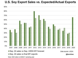 Wire story reports the new U.S. corn and soybean marketing year is just a month old, and the progress toward meeting big annual export targets is more advanced than normal in terms of sales, largely due to strong Chinese demand; U.S. corn and soybean export bookings stand at record levels for this early stage, and that bodes well for the expectation that 2020-21 shipments will rebound sharply from the dismal year-ago levels.