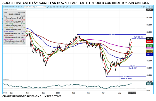 Live Cattle volume was light Friday ahead of afternoon Cattle on Feed Report. Many traders have their computers off this week and will wait to trade next week after the report. Futures gained this week but remain below cash cattle. With 2 weeks before first notice day, the indication with June bull spread to August is for a higher market.