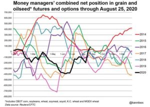 The player sheet had funds net sellers of 2,000 contracts of SRW Wheat; bought 3,000 Corn; bought 12,000 Soybeans; net bought 5,000 lots of Soymeal, and; sold 3,000 Soyoil.