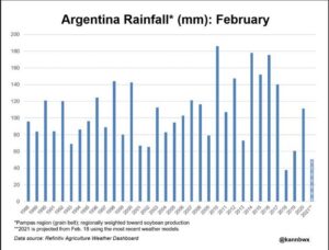 Wire story had after plentiful January rainfall that saved Argentine corn and soybeans from potential disaster, this month is on pace to be the country’s second-driest February in more than three decades, once again raising harvest concerns. Bumper crops were never expected in 2021 for the No. 3 corn and soybean exporter, but last month’s rainfall had some estimates on the uptrend. Crop conditions remain stable, though forecasts suggest Argentina is nearly two weeks away from its next substantial rainfall opportunity. Soybean planting began in earnest in November, while corn planting started more than a month earlier. Rainfall between October and December hit a 10-year low across the country’s grain belt, and soil moisture reserves were at a 12-year low for the time of year by the end of December.