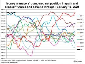 Strong demand for meat both on the export front and at home as COVID-19 restrictions begin to ease has sent Chicago Mercantile Exchange lean hog futures to contract highs over the last couple of weeks. The historic winter blast across the country and elevated pork prices in China have also been supportive. Investors’ optimism toward hogs has been on the uptrend, increasing sharply in the week ended Feb. 16.