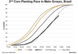 Yield risks arise whenever Brazil’s heavily exported second corn crop is planted late, but this year the delays are the worst in a decade, and the pressure for favorable weather through the next several months is substantially higher than usual.
