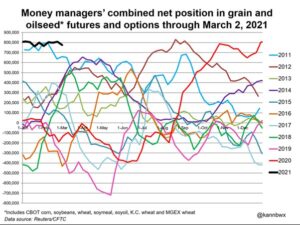 Speculators’ bullish bets in Chicago corn and soybeans have been oscillating at unusually high levels so far this year as global supplies are seen falling to multi-year lows. Fresh, supportive news was somewhat lacking last month, though concerns over crops in South America renewed price optimism late last week.