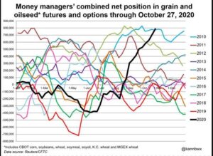 Speculators’ overall optimism about Chicago-traded grains and oilseeds rose last week to within striking distance of record bullishness for any time of the year, and that largely owed to strong buying in corn; but increasing pandemic fears and improving crop weather went against bulls late in the week; combined across Chicago corn, wheat, soybeans and products, and Minneapolis and Kansas City wheat, investors through Oct. 27 bought nearly a million futures and options contracts since the rally began in mid-August, the most ever for such a period.