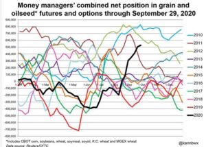 The player sheet had funds net buyers of 4,000 contracts of SRW Wheat; net sold 11,000 Corn; net sold 3,000 Soybeans; bought 4,000 Soymeal, and; net sold 5,000 Soyoil.