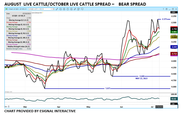 Trade volume was active Monday. Volume for August Live Cattle was 41,149 contracts and October Live Cattle volume was 33,142 contracts. Monday was the start of the Goldman Sachs roll. The wide spread between cash and futures still encourages producers to move cattle as soon as a packer will take them
