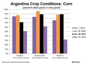 Wire story reports Argentina’s upcoming corn and soybean harvests will not be among the country’s best on record, but they certainly seem to have averted possible disaster a la 2018 after a historically dry start. Above-average rainfall in January went against the general dry trend common across Argentina during a La Nina, the cool phase of the equatorial Pacific Ocean. This brought much-needed moisture to the crops, which as of last week were mostly in good condition. But the La Nina pattern is still in place, and Argentina is not yet out of the woods as the forecast has turned dry through mid-month, just as crops begin to enter the critical stages for yield formation. As of Jan. 28, data from Argentina’s agriculture ministry suggested that the portions of soybeans in good or very good condition in Buenos Aires, Cordoba and Santa Fe were roughly 83%, 90% and 96%, respectively. Those three provinces account for three-quarters of the country’s planted area.