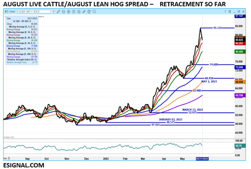 June Live Cattle are trading discount to cash cattle. The 5 day average negotiated steer cash price at $177.94 is premium to June 2023 Live Cattle settling Tuesday at $169.12. Futures are trading $8.82 under the 5 day cash negotiated price with next Monday afternoon first notice day. Excess rains in parts of Texas is becoming a problem.