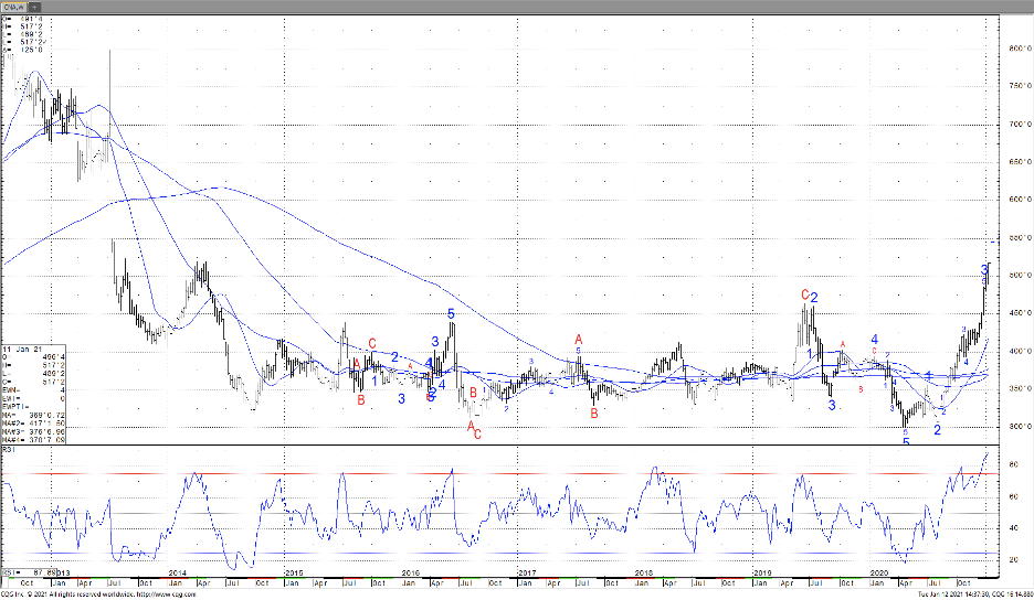 Weekly nearby Chicago wheat futures chart