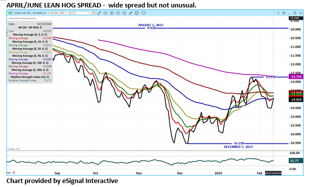 February 2024 Lean Hogs are 2 cents under the CME Lean Hog Index. The CME Lean Hog Index to the CME Pork Index and has been narrowing but still shows a positive packer margin. The higher pork market didn’t seem to do anything for Lean Hog futures as Lean Hogs ignored the higher pork market and closes down.