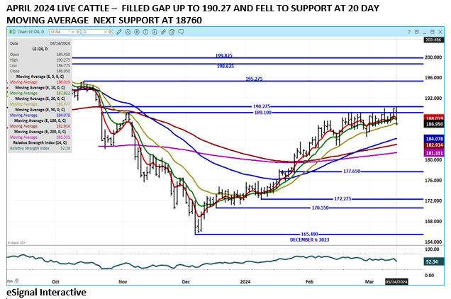 When comparing prices on the close Thursday, they are close to where prices were last Friday.  Did the Live Cattle market tumble Thursday?  It tumbled for traders long cattle but in reality, it just erased trading Monday through Wednesday.  Beef prices are being blamed for one of the reasons inflation at the grocery store remain high.