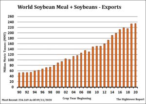 Soybeans trade sharply lower. Fact USDA was closed for holiday limited new news for the bulls. SX lower trade erased all of USDA Fridays gains. Some feel uncertainty over South America weather and record US Oct-Jan soybean exports could keep SX in a 10.10-10.80 range. US 2020/21 soybean supply and demand has tightened to the point South America and US will need good crop to satisfy demand. In April, SX was near 8.31 low. Dry US Aug weather and China buying helped SX rally to recent thigh near 10.79.  On Friday, USDA estimated World 2020/21 soybean exports near 167.9 mmt versus 166.3 estimated in Sep and 164.5 last year. US is 59.8 versus 57.8 previous and 45.6 last year. Some feel US exports could even reach 64.0. Brazil exports are estimated near 85.0 versus 92.5 last year. China soybean imports are estimated near 100 mmt versus 97.4 last year. Argentina soymeal exports are estimated near 29.0 mmt versus 26.7 last year. US soymeal exports are estimated near 12.2 mmt versus 12.6 last year.