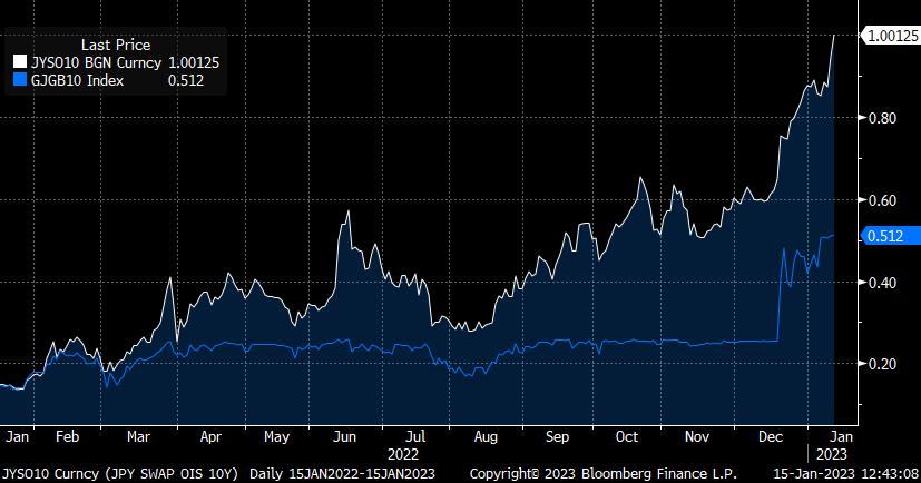 As for Japan, all eyes will be on Wednesday’s BoJ meeting, rather than the run of data, which is forecast to see a somewhat smaller trade deficit on lower energy prices, a renewed though modest slip of 1.2% m/m in the ever volatile Private Machinery Orders, and for National CPI to echo Tokyo readings, ticking up 0.2 ppt to 4.0% headline, and to 3.1% from 2.8% ex Fresh Food & Energy. The consensus expects no change in either the Call Rate or 10-yr JGB yield targets, nor any further adjustments to the bandwidth on the latter. That said, markets would appear to be discounting the risk of a further move if the pressure on 10-yr JGB yields, and a colossal widening in the 10-yr JPY OIS swap spread (see chart) are anything to go by. However the latter is far more technical than some would have us believe, and consequent on the December band widening, and testament to the fact that Japan’s money markets have been ‘cryogenically frozen’ for many years, thanks to BoJ policy. Restoring JPY money market functionality was always going to be painful, as well as sending shock waves elsewhere, and was always going to be a sine qua non before the BoJ could start to wind back its ultra-easy monetary policy. The BoJ will update its forecasts, with current FY core CPI likely to be revised up slightly from 3.9%, but the issue is whether it tweaks its forecasts up for the following 2 years from prior estimates for both of 1.6%, i.e. falling short of the 2.0% target; GDP forecasts for FY 2022 & 2023 may be tweaked modestly lower. If FY 2023 CPI forecast is revised higher (?1.8%), the BoJ may well emphasize that this is primarily due to continued supply problems, and reiterate that a shift in policy would have to see both stronger (domestic) demand and an acceleration in wage growth. Given the dislocation of JPY Swap rates relative to JGB yields, it will underline that it is monitoring and assessing related financial stability issues, but is unlikely to adopt or announce any specific measures to deal with this.