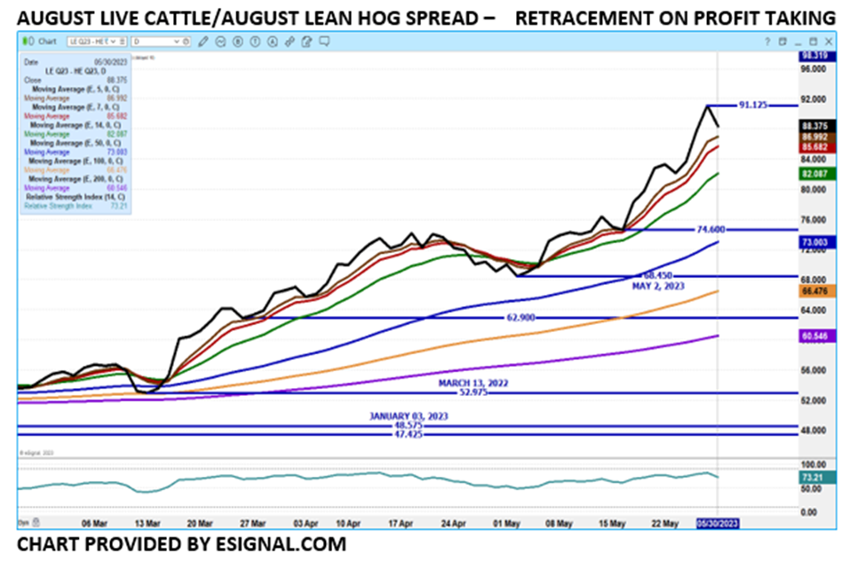 Lean Hogs were higher Tuesday with profit taking and the trade evening up June Lean Hogs nearer to cash hogs and where the CME Lean Hog Index is priced. However, a big part of the trade was profit taking on Live Cattle/Lean Hog spreads.