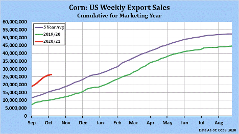 Corn futures traded mixed. CZ was near 4.02 down 1 cent and CZ21 was up 1 cent and near 3.96. Managed funds were early buyers of 3,000 corn. We estimate Managed funds are net long 205,000 corn. Talk of rains in Brazil and Argentina may have offered resistance. Noon Brazil maps were drier. Brazil could soon announce they will temporarily drop their 8 pct import tax on corn and soybeans. Problem is that US gulf elevations may be maxed out. Corn spreads have narrowed on increase export demand and slow farmer selling. Weekly US corn export sales were 655 mt. Total commit 26.5 vs 10.3 ly. China commit 10.1 mmt with 3.7 in unknown. Some Feel China may take 24 mmt of US corn. There is talk that Ukraine may have sold 8 mmt to China. USDA announced 175 mt US corn sold to Mexico. USDA goal is 59.0 mmt versus 45.1 last year. USDA estimates World corn trade near 184.7 mmt versus 170.5 last year. Brazil is 39.0 versus 34.0 last year. Argentina is 34.0 versus 38.0 last year. There is concern about global corn supply versus EU demand. USDA estimates EU imports at 24.0 mmt versus 19.0 last year. Ukraine crop could be lower and they may have sold most of their export corn to China. FACE (Informa) est 2021 US corn acres at 92.0 vs 91.0 this year. Some are at 95.0. They estimated the 20210 corn crop at 15,310 mil bu versus 14,722 this year. This assumes a yield of 181.0 versus 178.4 this year.