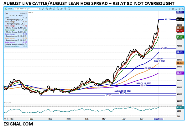 Live Cattle futures made new high contract closes Friday and for the third day in a row. Volume was moderately active. With the 5 day negotiated steer price at $176.69 and June 2023 Live Cattle closing on May 26th at $167.35, the difference is $9.34. First notice day is the afternoon on Monday, June 5th. There is still plenty of time for June futures to move the gap closer between futures and cash.