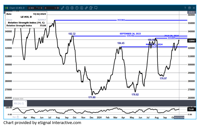 There has been a buildup in open interest for Lean Hogs on light volume.  It is an alert to be cautious.  As reported last week, over past 10 years, 80% from mid-October the  prices are lower into December.  2024 may be the opposite, but controlling risk is a wise choice. The difference between the CME Lean Hog Index and the CME Pork Index is widening.  This is packer positive. If packers need to increase kill, they will pay up.