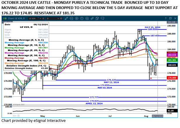Starting out the week, August live cattle look like packers are going to take off more cash. There is a big discount to Midwest cattle and about a $2.00 to $3.00 discount to the southwest. Boxed beef was higher on Monday but load movement was light with a total of 99 loads, 61 loads of choice and 22 loads of select. With the light slaughter of last week, beef prices should be up. Packers are going limit kill until they can see a profit from slaughter.