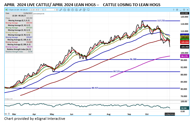 Live Cattle totally reversed last week’s gains. Packers are tightly controlling slaughter. Packer margins are in the red. In the Southwest they have fewer cattle for slaughter that are Choice.  They won’t buy more cattle than the orders they have for beef.