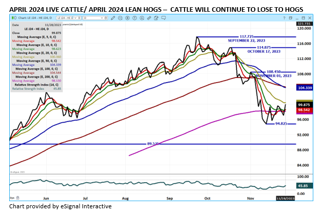 Was Tuesday end of the month profit taking or possibly for some funds end of the year, was it Tuesday turn around or was it the start of a move up after the steep decline over the past 2 months?  Volume was moderately active but far from heavy indicating it was possibly profit taking. But as December nears first notice day in a few days and the reality of trading in a spot month and currently below the cash price, it also could indicate cattle could turn higher.