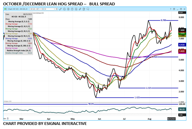 Early Friday spec traders moved Lean Hogs higher and with the lead month October Lean Hogs, spec traders have an easier opportunities to move markets. But when morning pork prices were released and the daily pork carcass was down $10.55, loins down $3.55, Hams falling $4.70 and Bellies down $53.78, traders needed to liquidate the early move higher on Lean Hogs. There should be some reality to futures and cash.