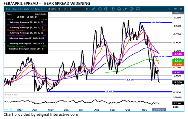 Specs are long outright futures at the same time specs are bear spread December, Feb and April. Monday from June 2025 into the end of 2026 lean hogs made contract highs. April made a contract high close but not a contract high. The RSI on hogs are not overbought.
